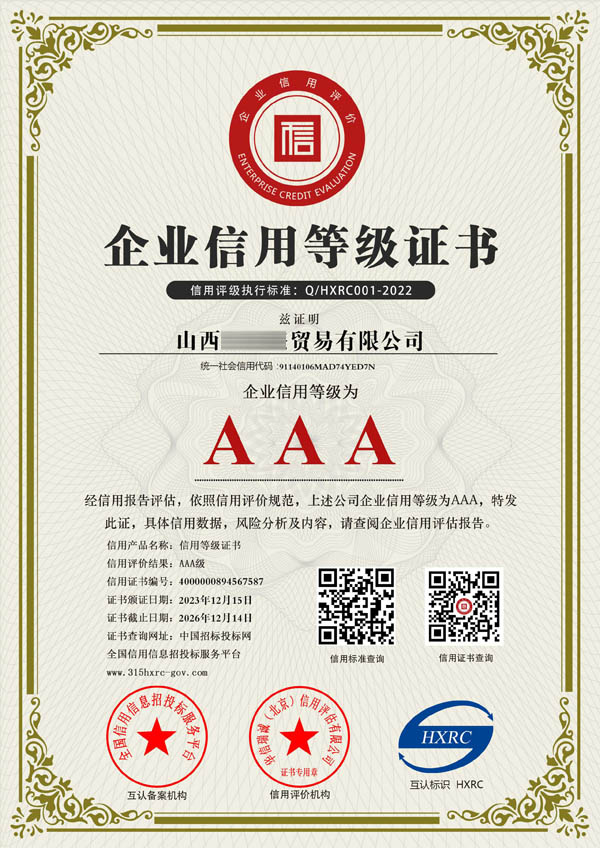 企業(yè)AAA信用等級(jí)證書(shū)主要包含:AAA企業(yè)信用等級(jí)、AAA企業(yè)資信等級(jí)、AAA重合同守信用、AAA質(zhì)量服務(wù)誠(chéng)信企業(yè)、AAA誠(chéng)信經(jīng)營(yíng)示范單位、誠(chéng)信企業(yè)家、誠(chéng)信經(jīng)理人、AAA重質(zhì)量守信用、AAA重服務(wù)守信用、AAA誠(chéng)信供應(yīng)商等。我們將一如既往繼續(xù)努力,能夠和您合作是我們的榮幸!山西AAA企業(yè)信用評(píng)級(jí)網(wǎng)本著“誠(chéng)信、專(zhuān)業(yè)、優(yōu)質(zhì)、高效”的宗旨為廣大客戶(hù)提供全方位的認(rèn)證咨詢(xún)服務(wù),本公司愿與廣大的新老客戶(hù)真誠(chéng)合作、攜手共進(jìn)!